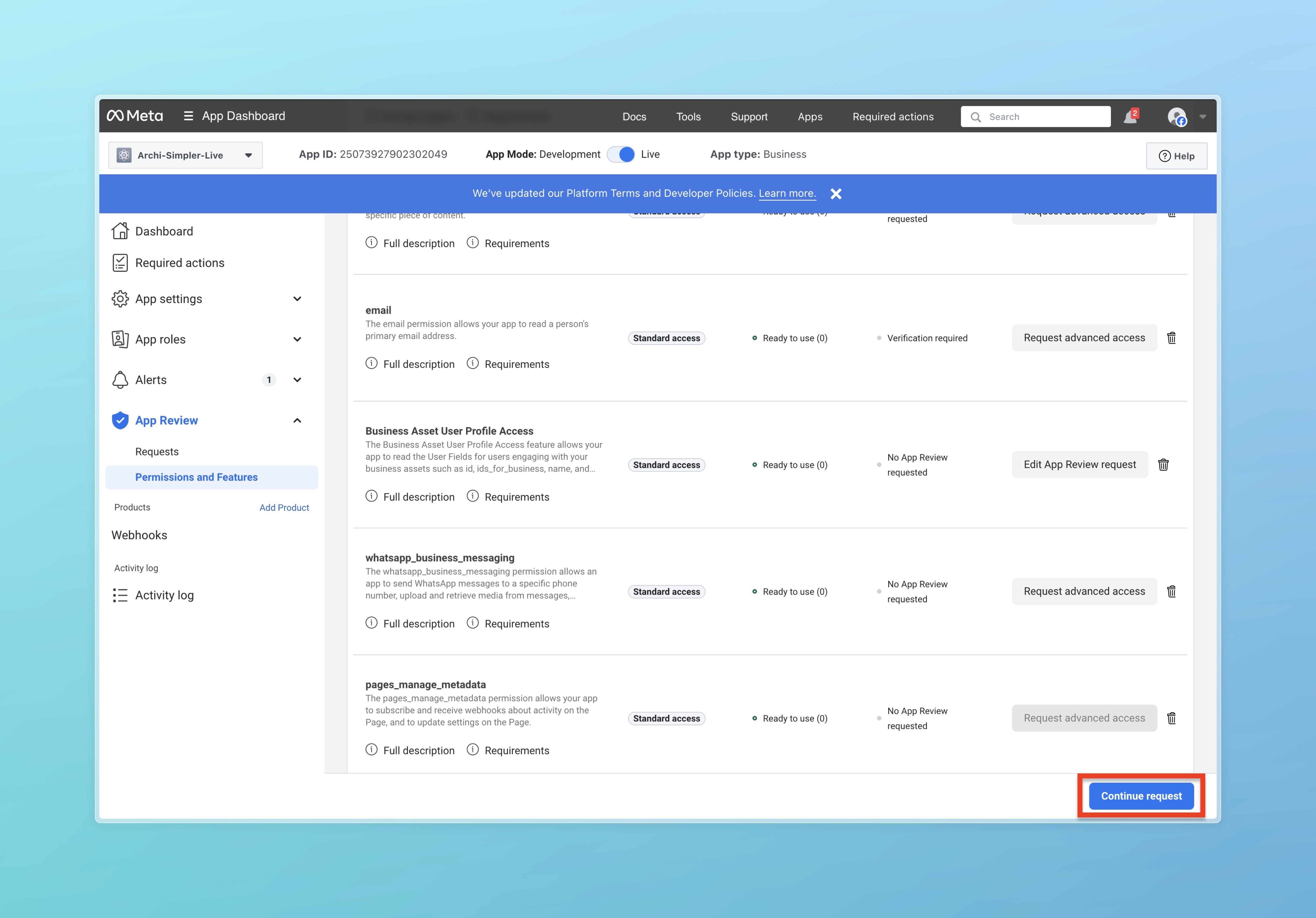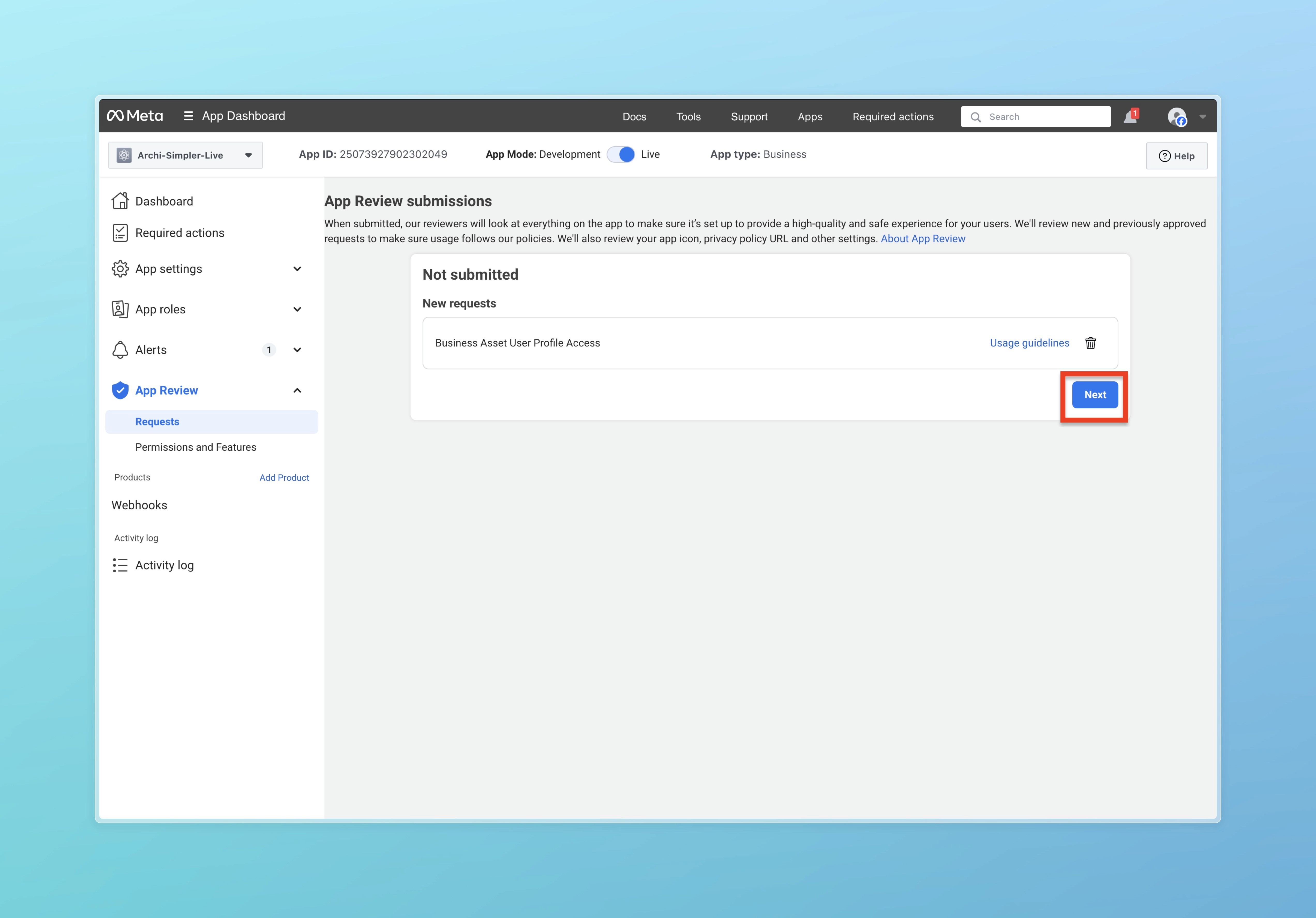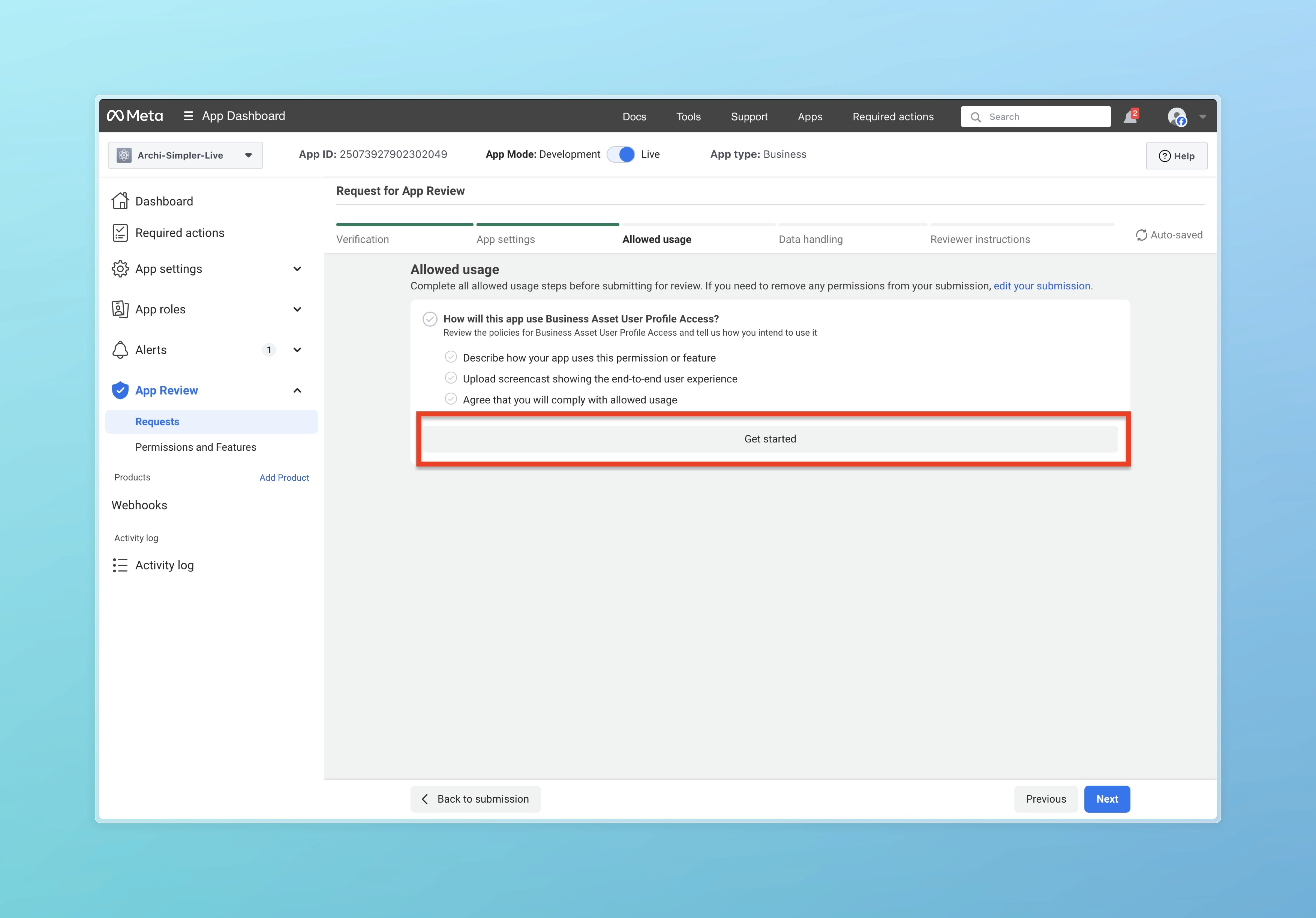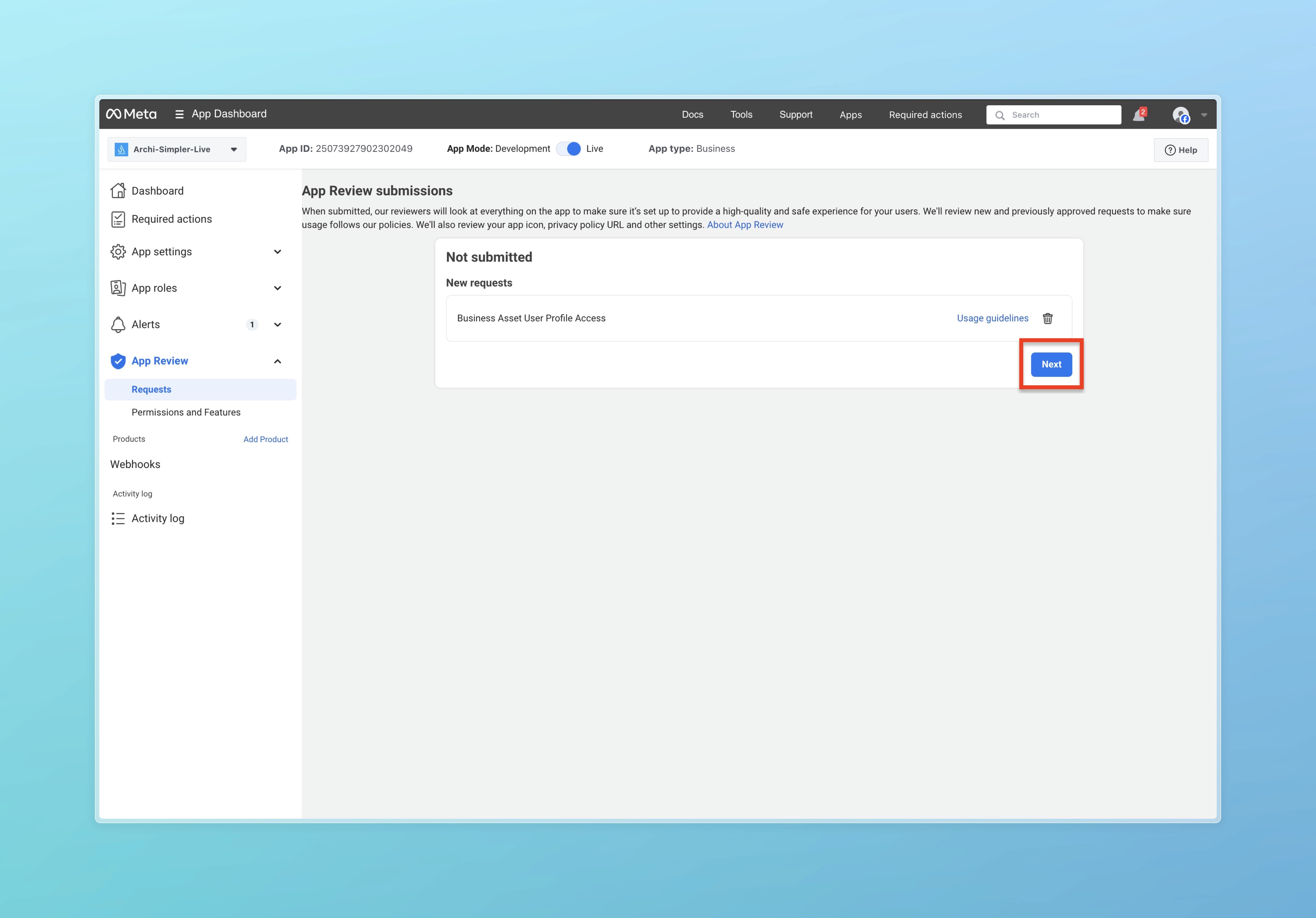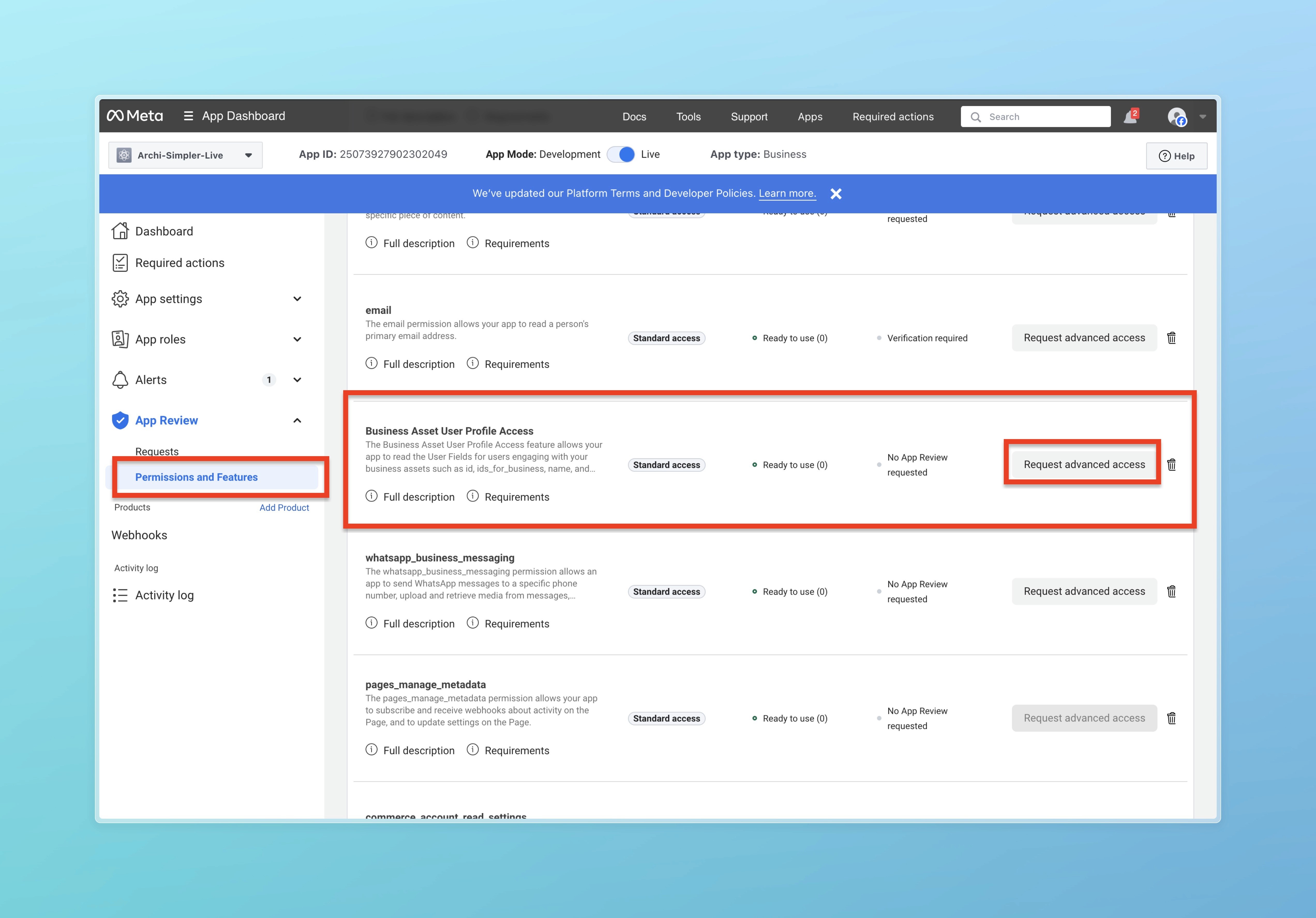 Open the link https://developers.facebook.com/apps/ and select your application. Then go to App Review and select Permissions and Features. Request the Business Asset User Profile Access permission by clicking the Request advanced access button.