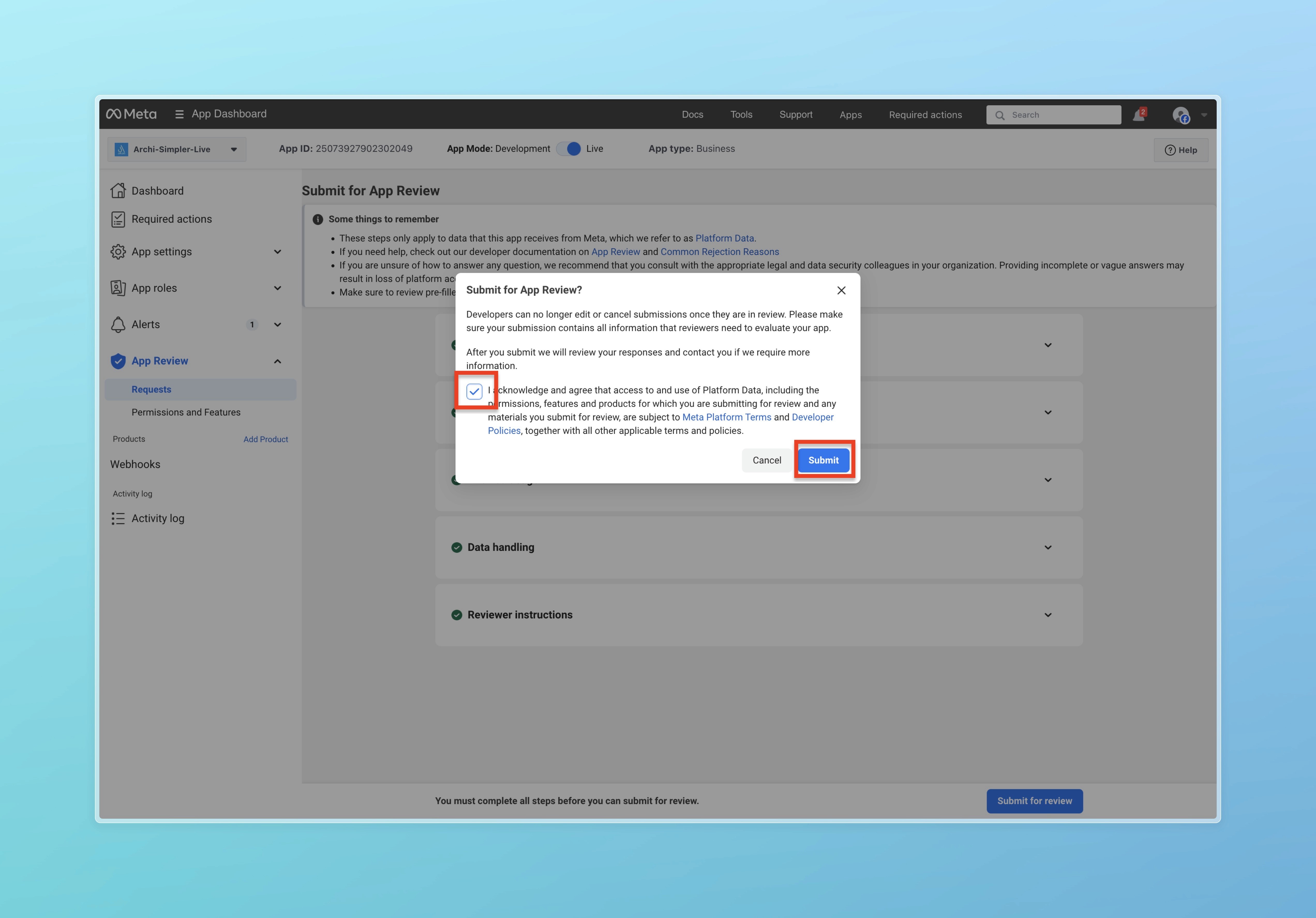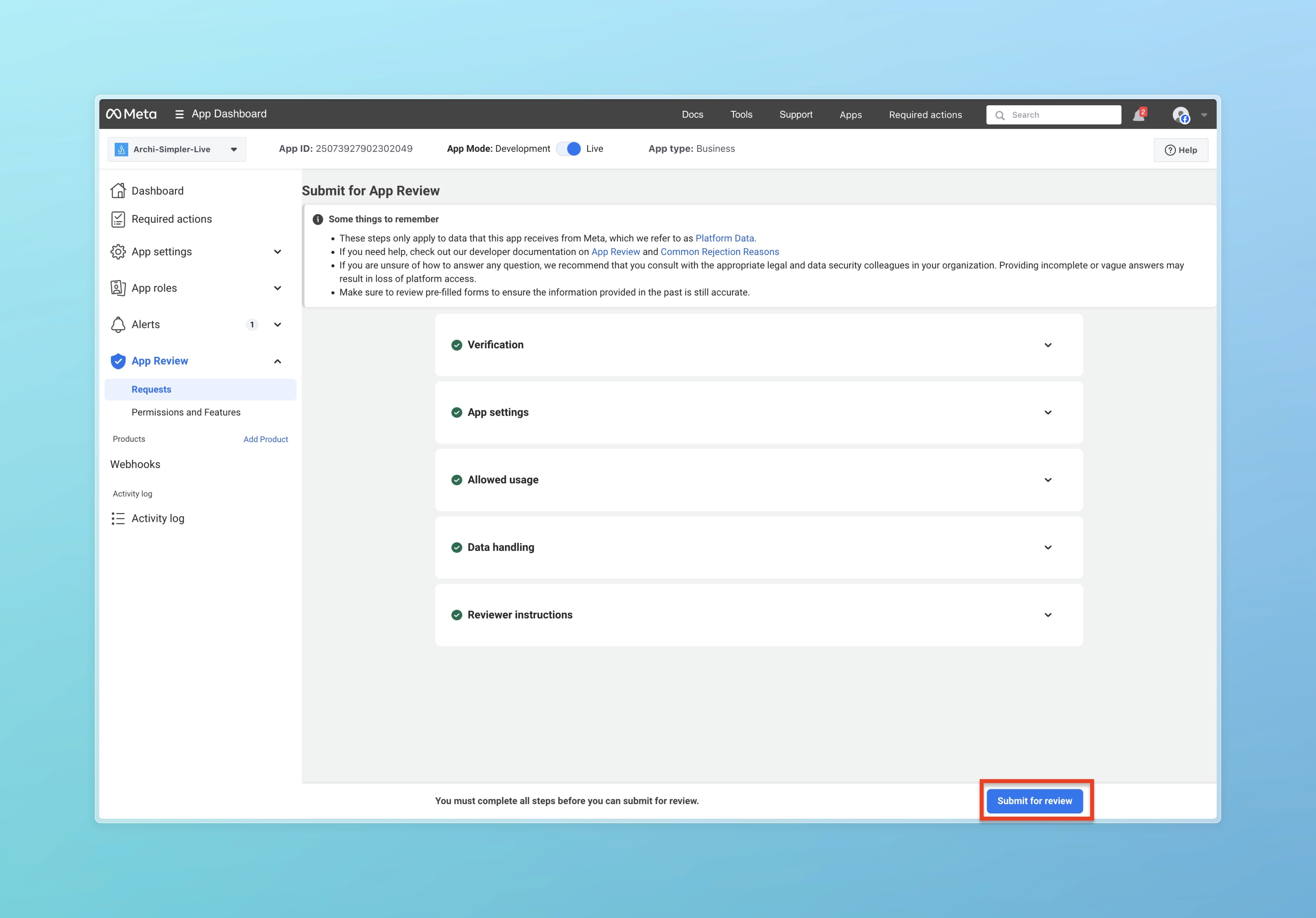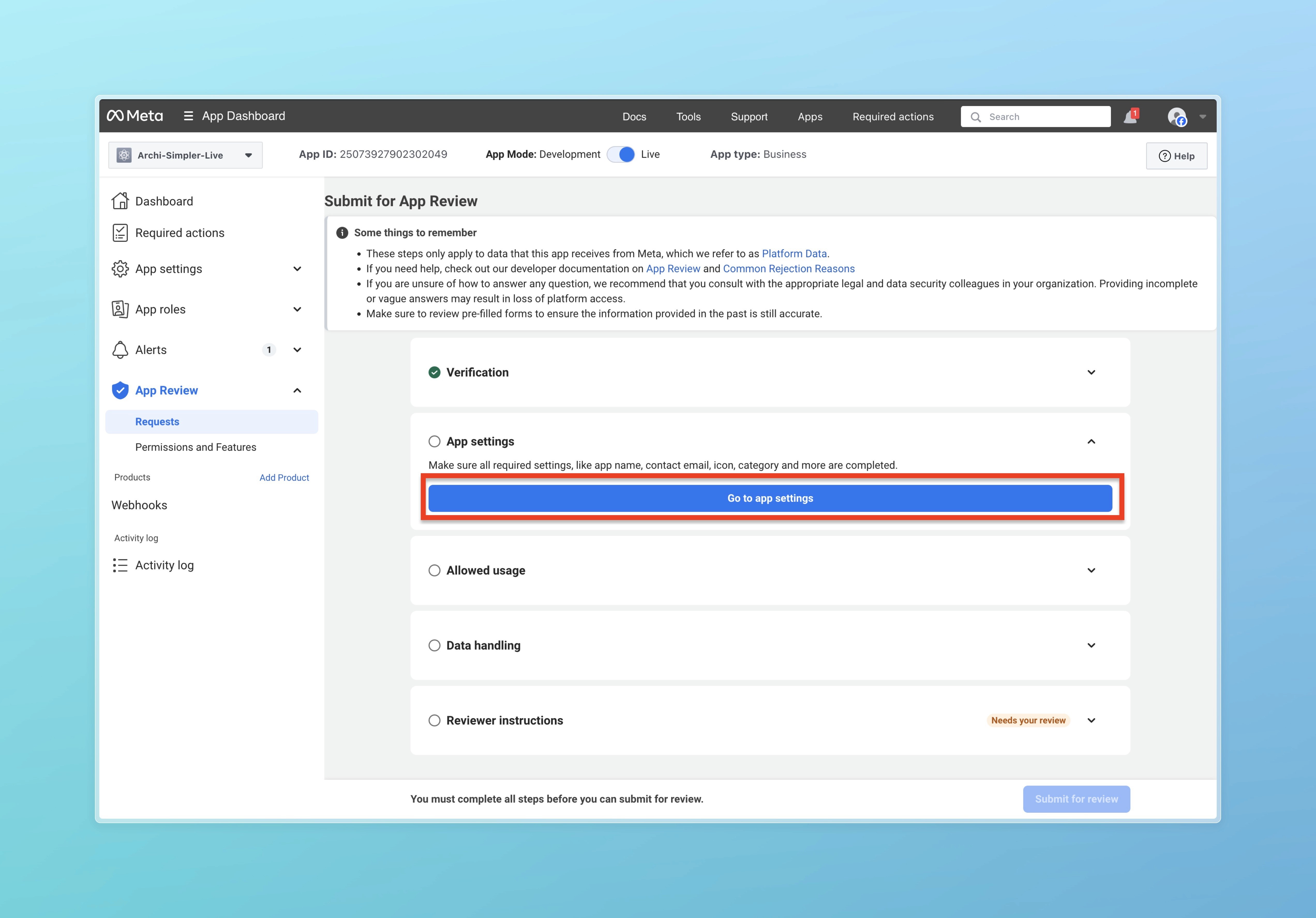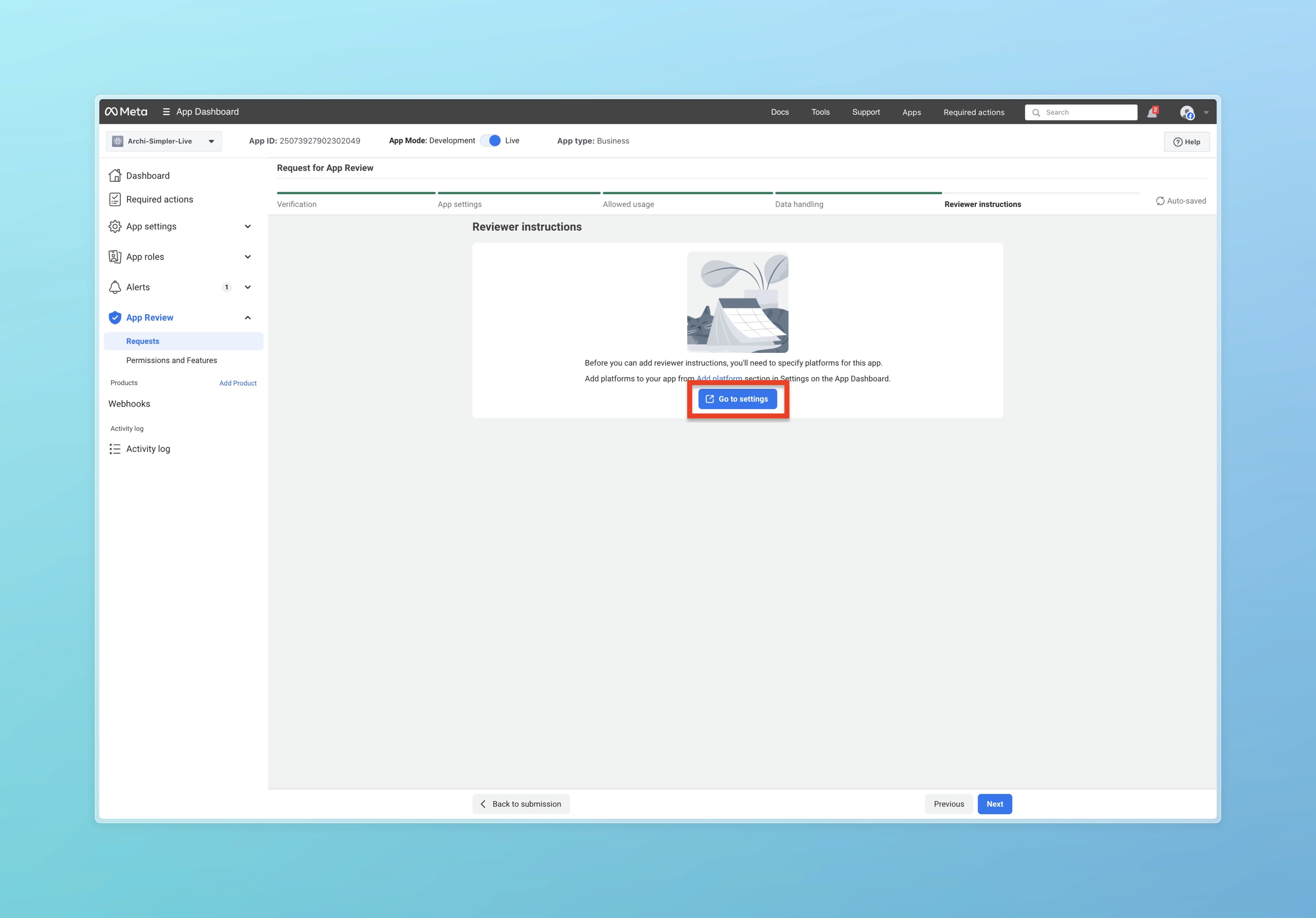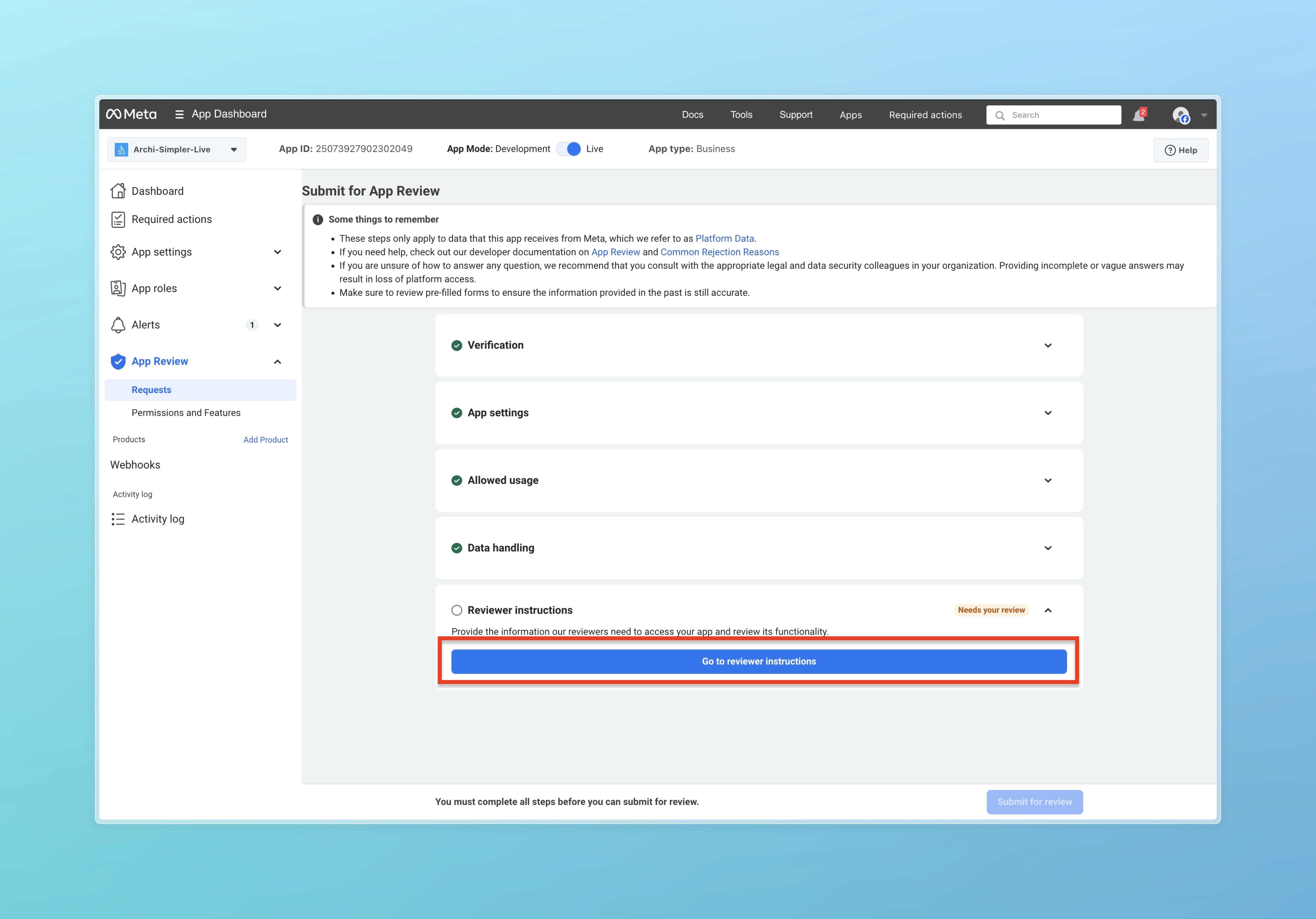 Open the link https://developers.facebook.com/apps/ and select your application. Then go to App Review and select Permissions and Features. Request the Business Asset User Profile Access permission by clicking the Request advanced access button.
