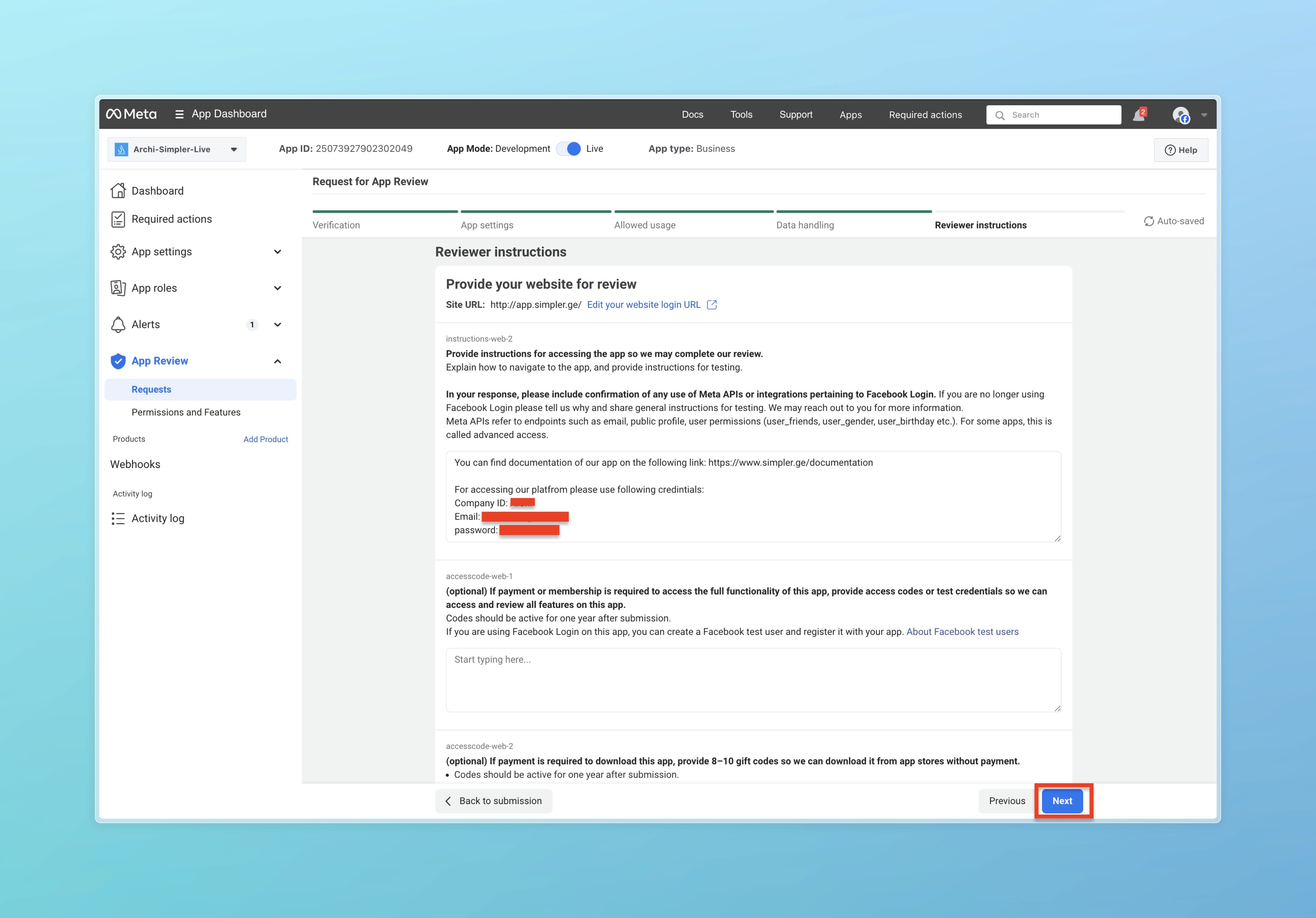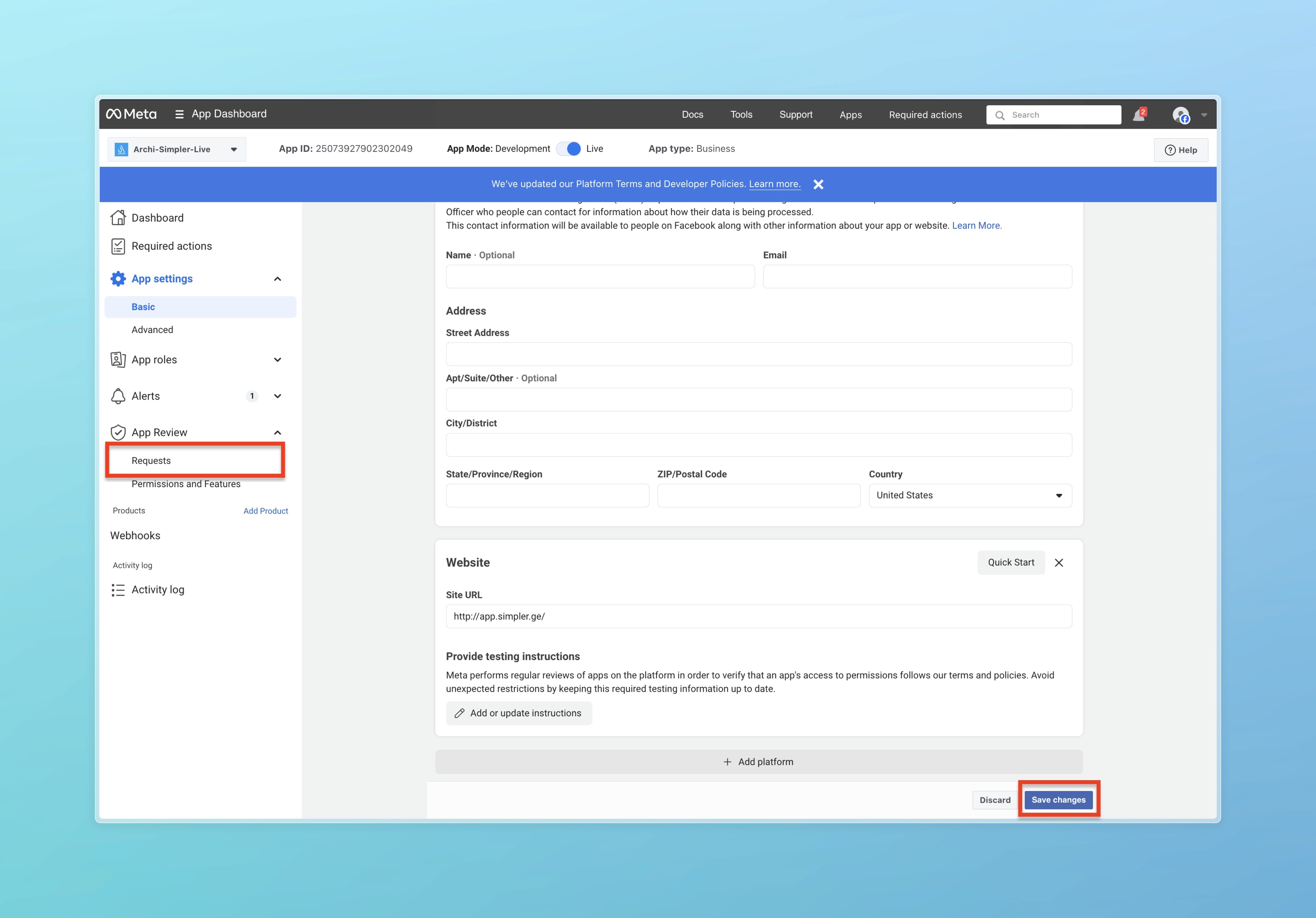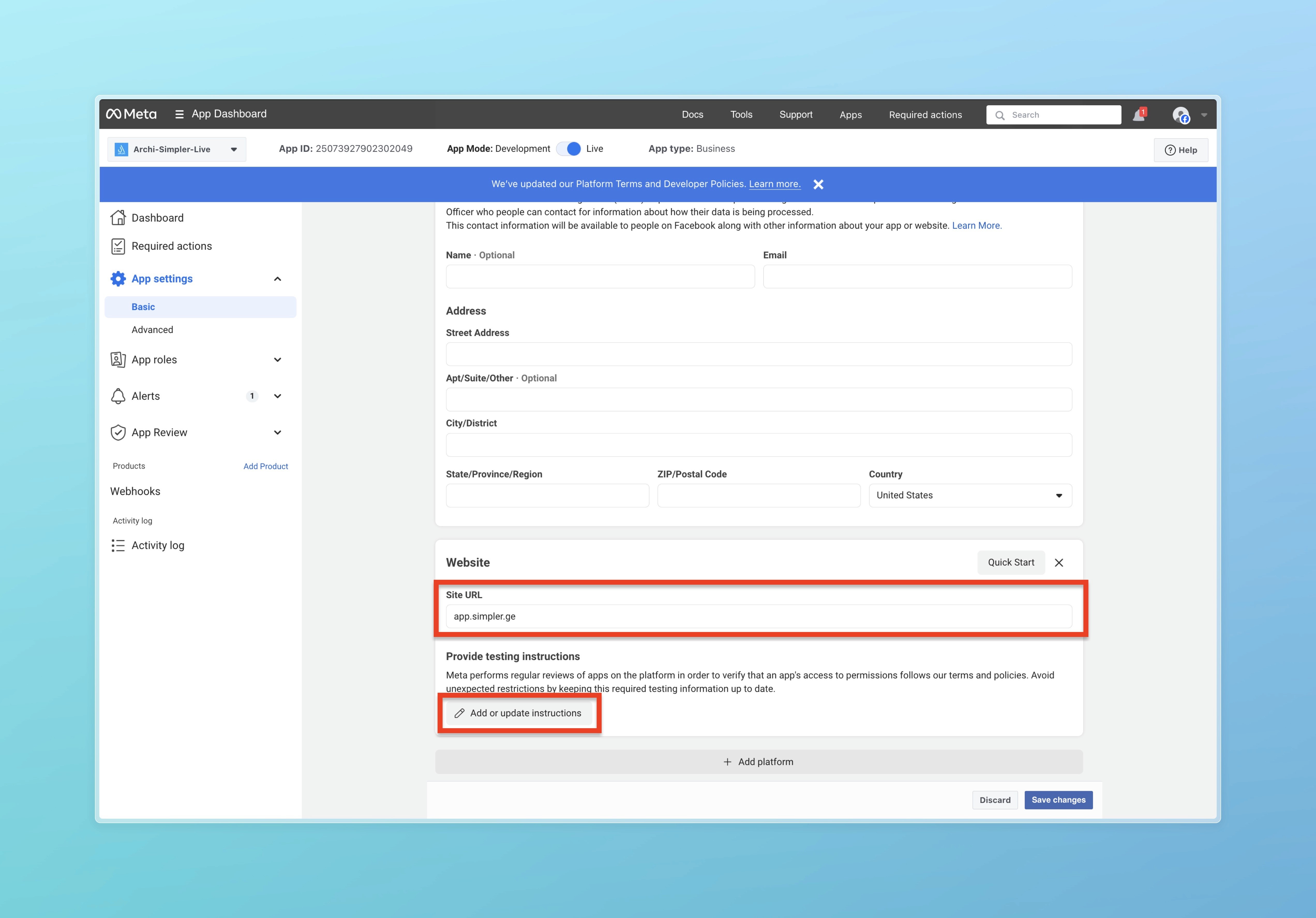 In Site URL, specify https://app.simpler.ge and click Add or update instructions.