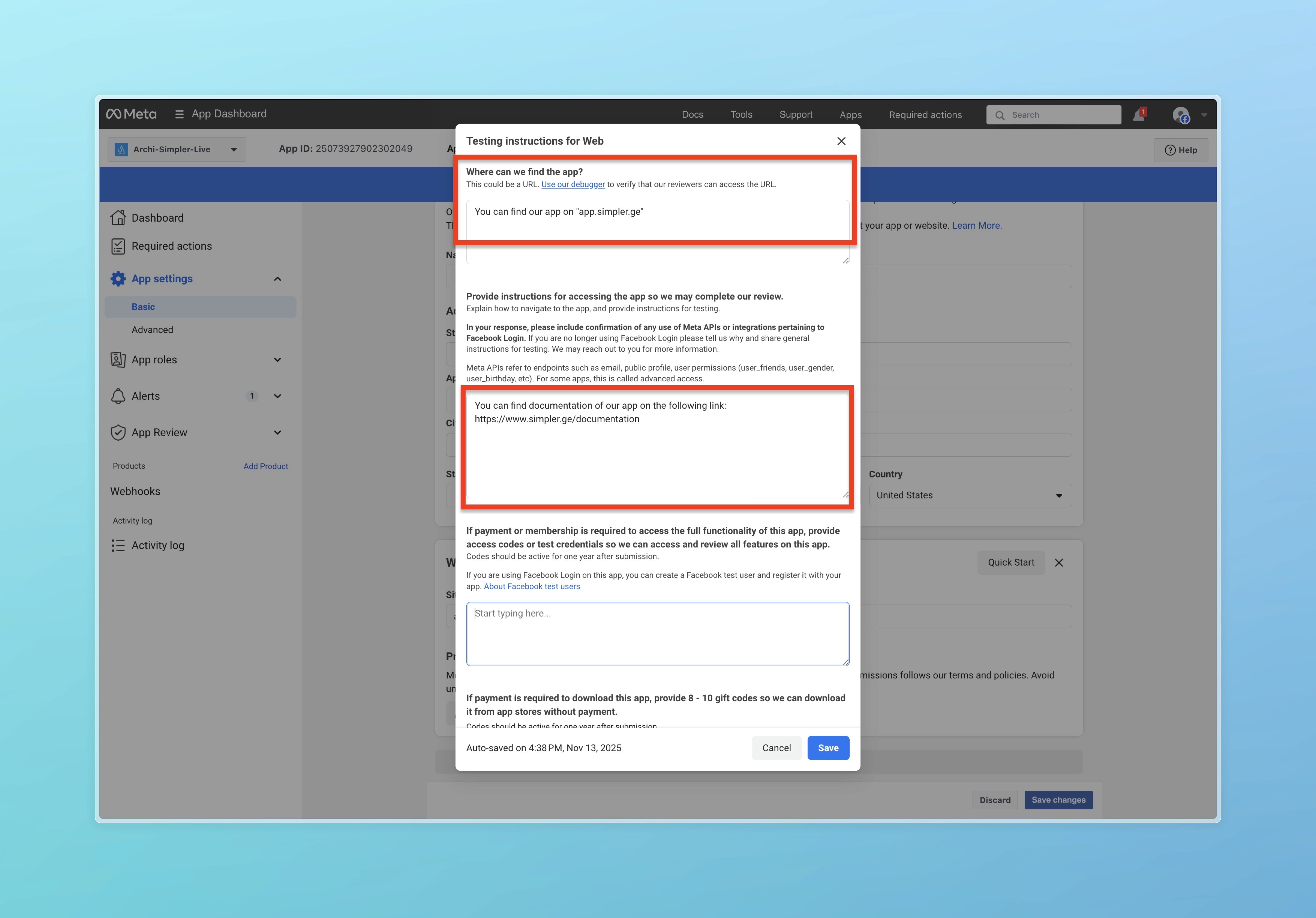 In the first text box, enter "You can find our app on "app.simpler.ge", and in the second box enter "You can find documentation of our app on the following link: https://www.simpler.ge/documentation" and click the Save button.