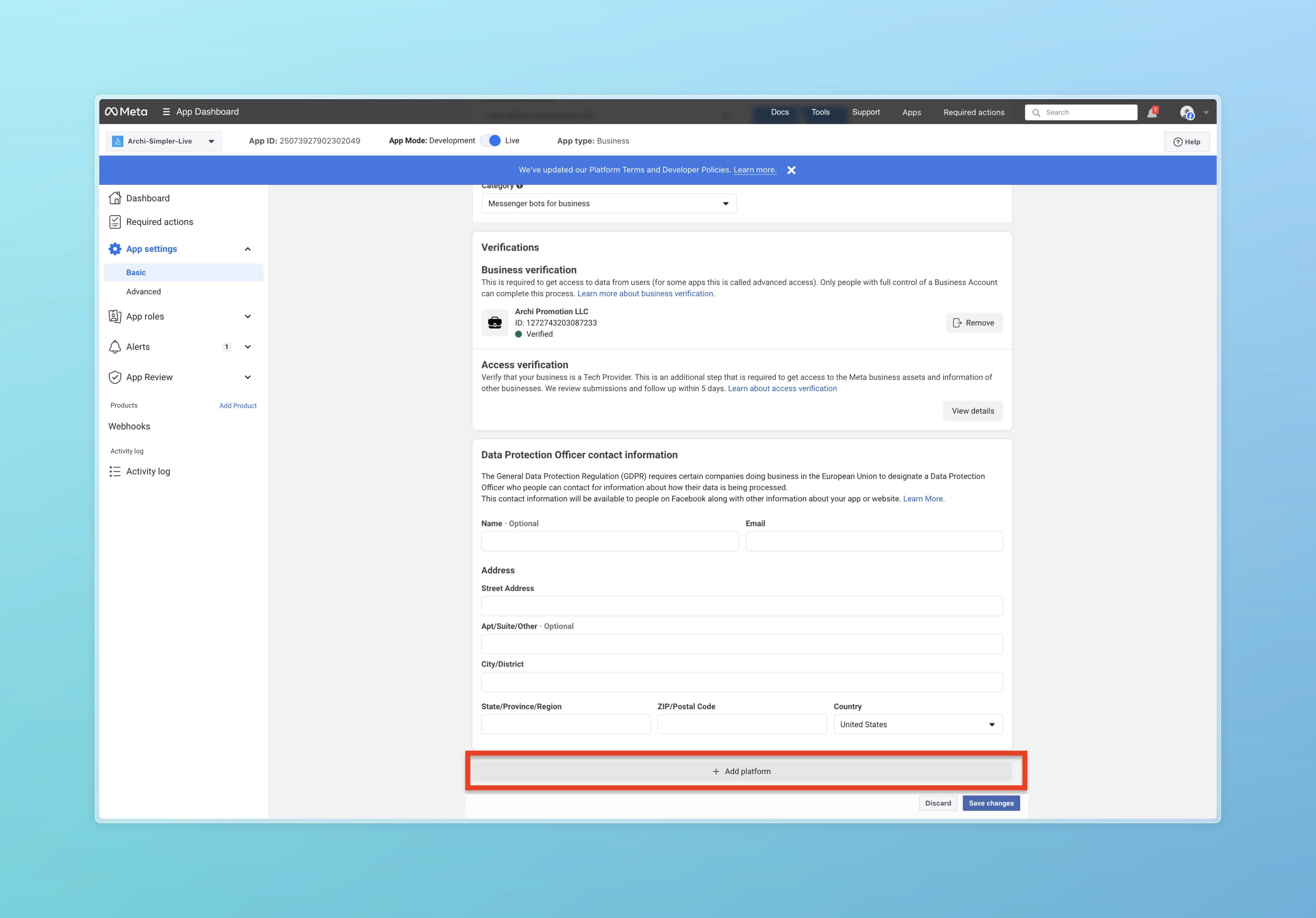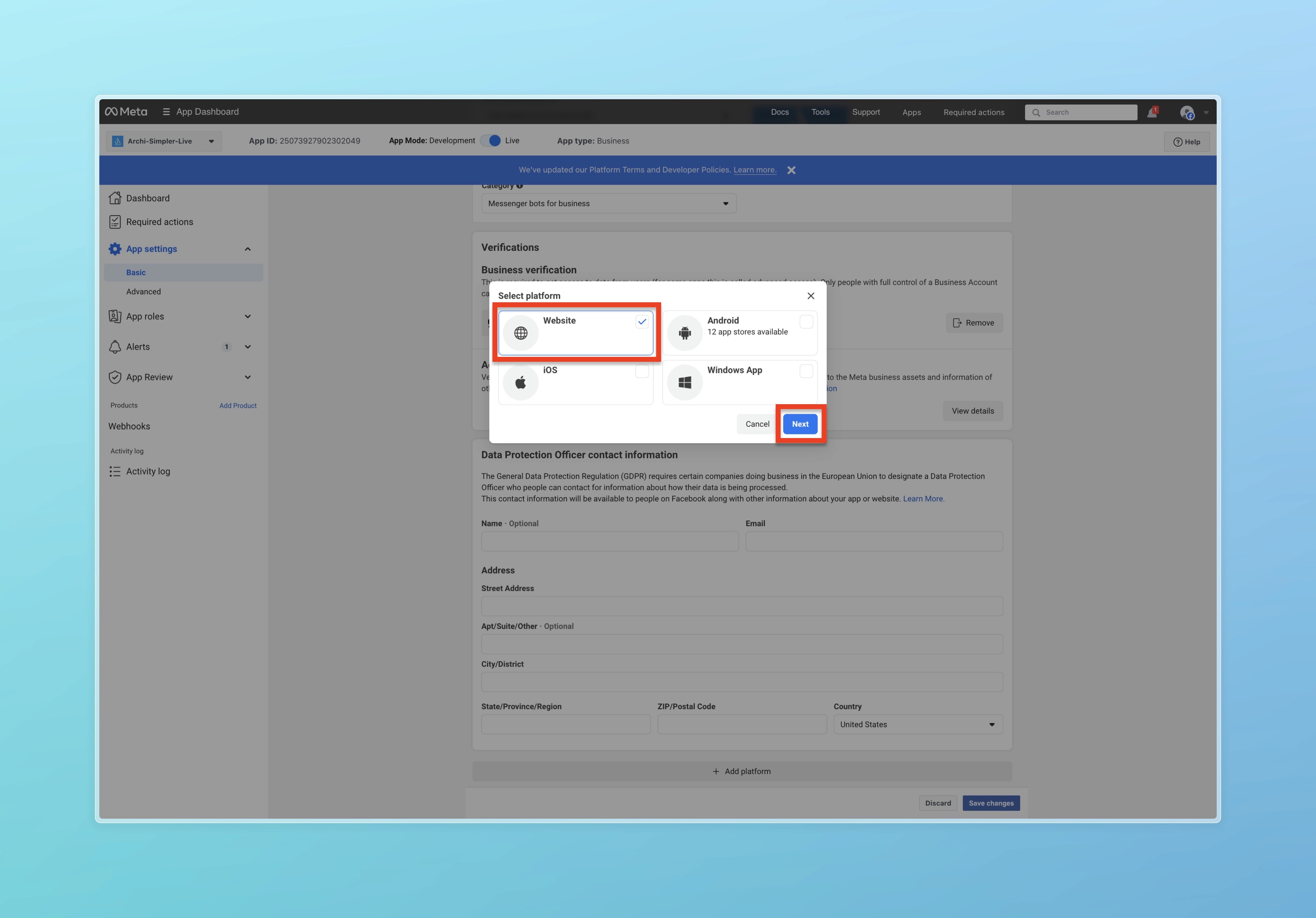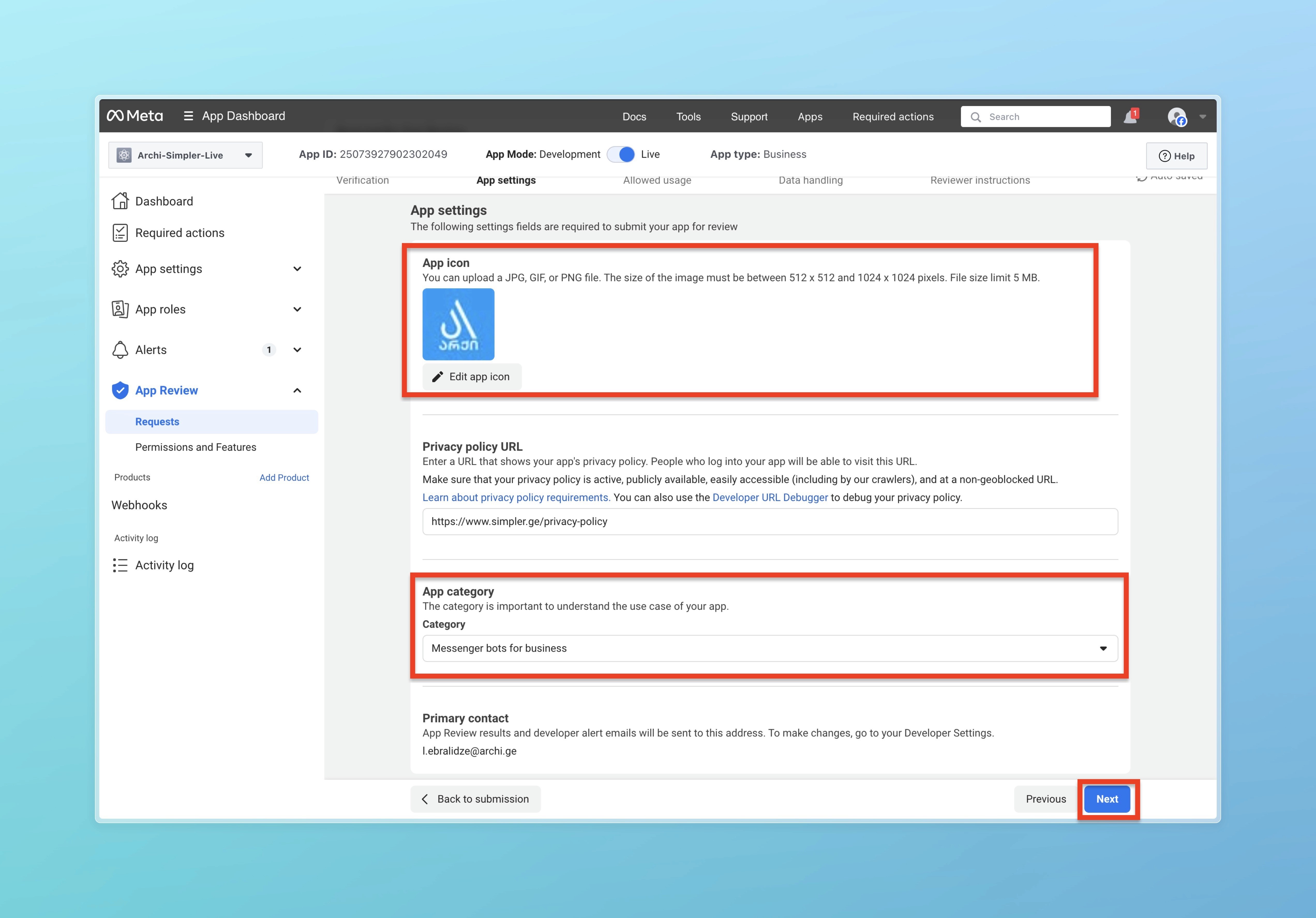 Select an Icon for your App and choose Messenger bots for business in the App category. After this, click the Next button.