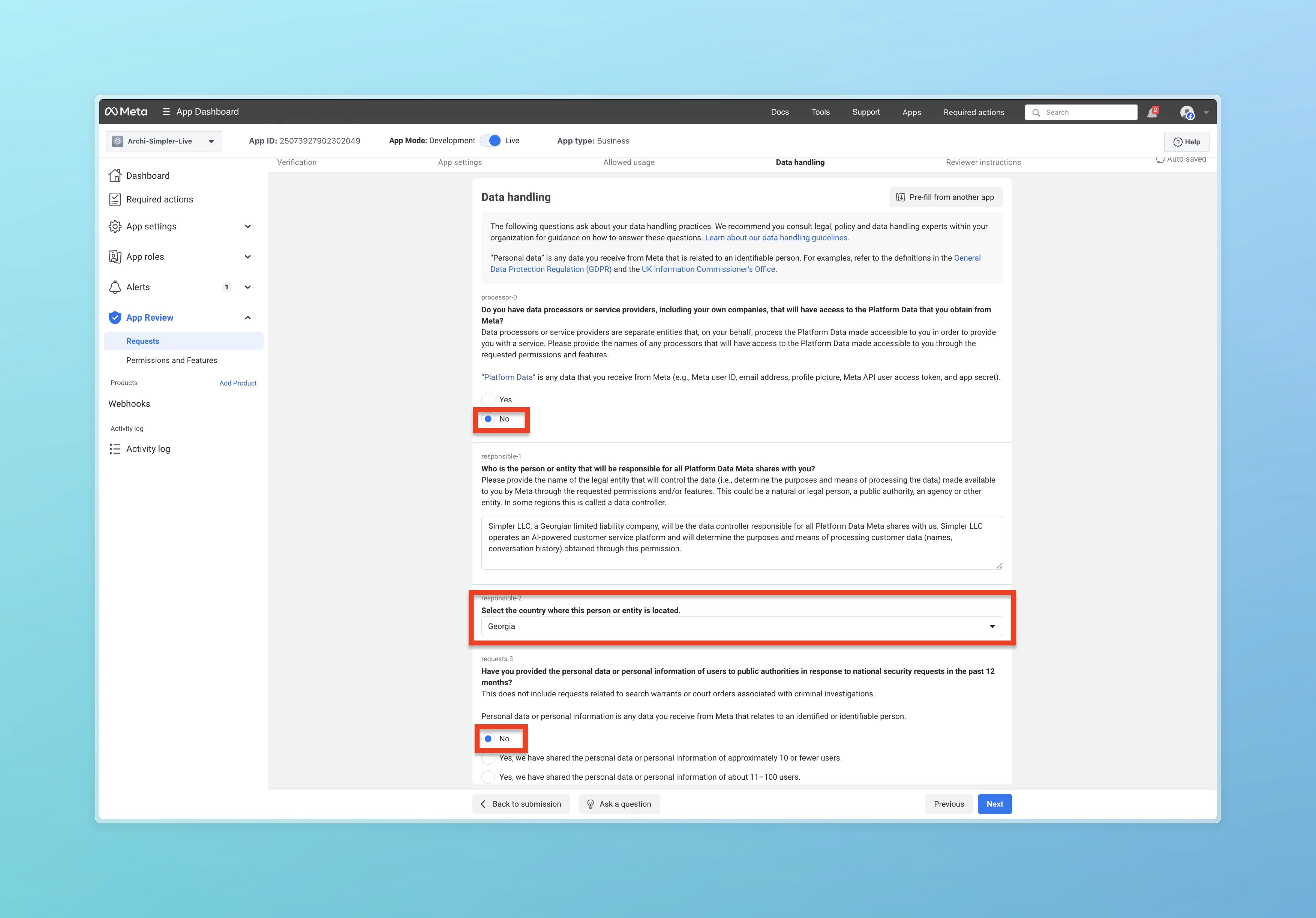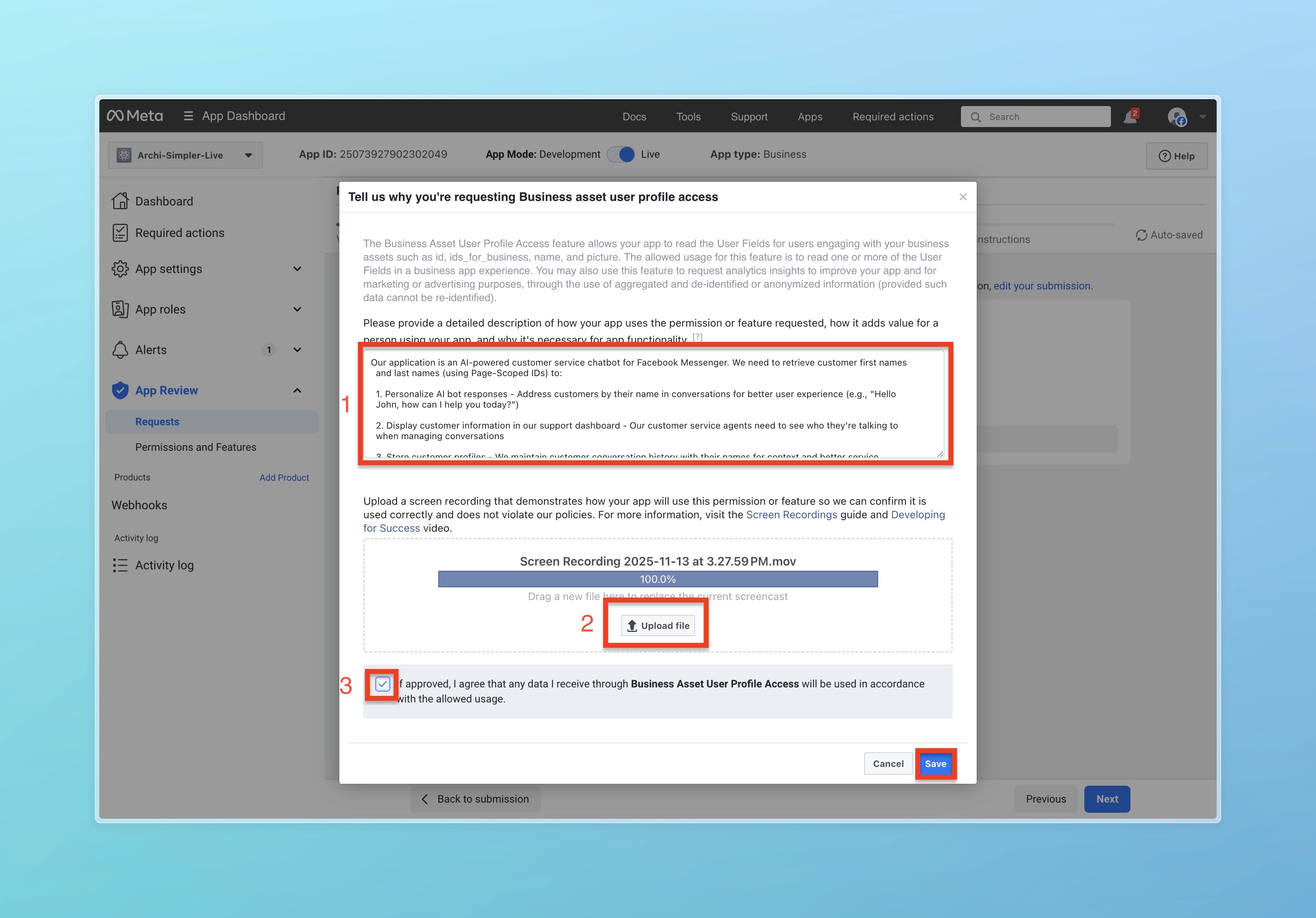 In the first text box, enter "Our application is an AI-powered customer service chatbot for Facebook Messenger. We need to retrieve customer first names and last names (using Page-Scoped IDs) to:
